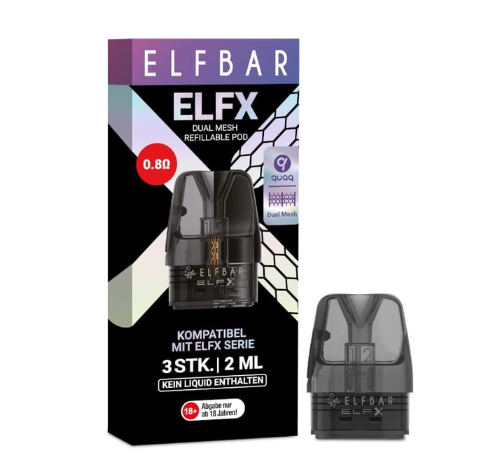 Die Elfx Pods stellen austauschbare und nachfüllbare Komponenten dar, die für das gleichnamige System von Elfbar konzipiert wurden. Sie markieren den Übergang des Herstellers in den Bereich wiederverwendbarer Systeme und etablieren neue Maßstäbe in der Pod-Entwicklung. Im Kern integrieren diese Pods eine fortschrittliche Dual-Mesh-Coil-Technologie mit QUAQ Heating Technology. Diese ermöglicht eine gleichmäßige Wärmeverteilung, was zu einer besseren Entfaltung des Aromas führt. Zudem verdoppelt sich die Haltbarkeit im Vergleich zu traditionellen Single-Mesh-Coils, und der Dampf bleibt intensiv bei konstanter Leistung.
